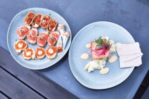 見学に訪れたゲストに、シェフがサーモン料理を振る舞う。(右)北欧伝統のサーモン料理、「グラブラックス」。塩と砂糖、ハーブで数日間マリネしてから軽くグリルすることで、しっとりした食感と脂の甘みが引き立つ。(左)スモークサーモンとマスの卵を使ったアペタイザー。
