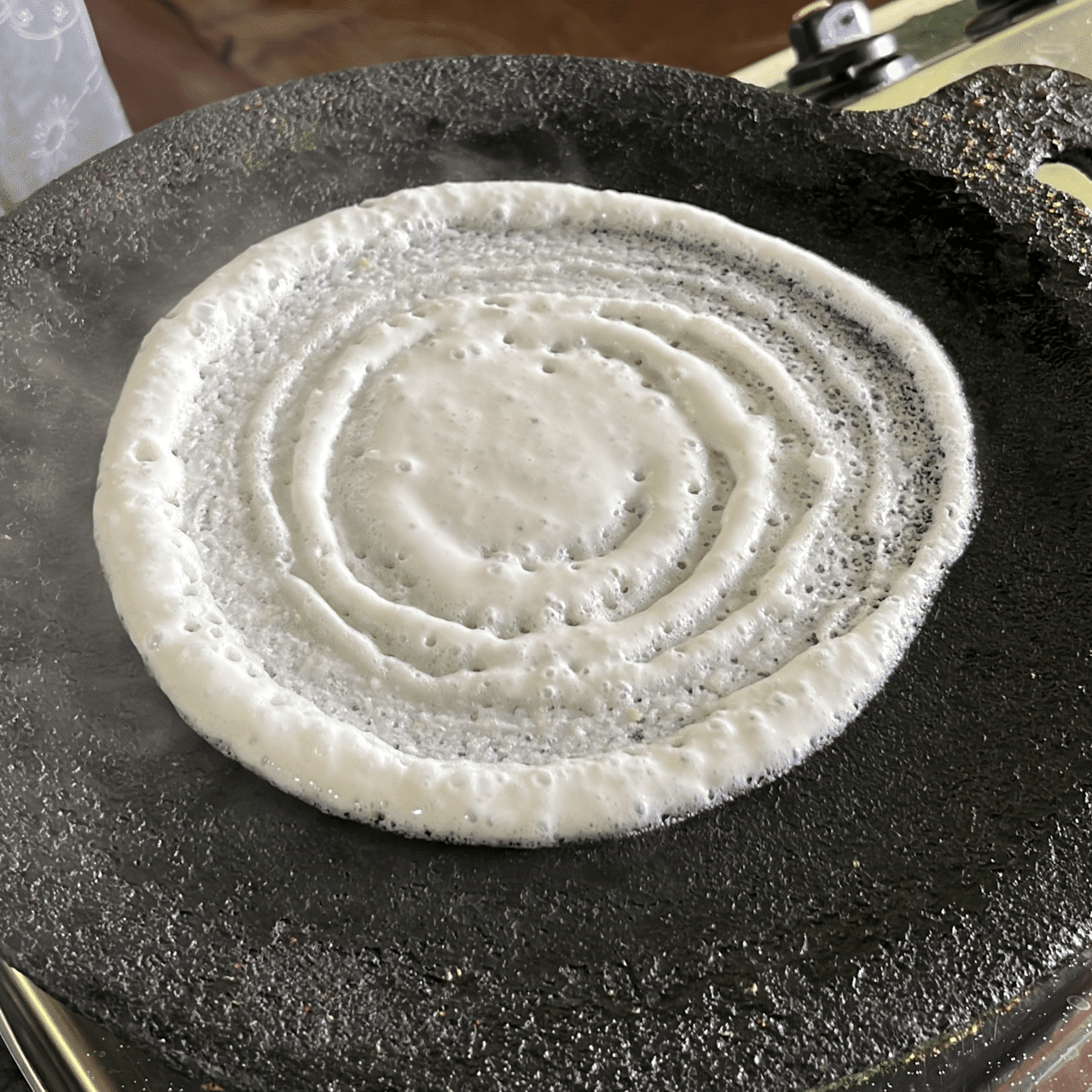 腕だけでなく体幹を中心に体ごと回すと円がきれいにできる。表面が乾いてきたら油を少量差す。中火のまま一気に焼き上げれば、縁が自然に持ち上がって、するりと剥がれるようになる。厚めにしたいときは火をやや落として短く蓋をし、蒸すようにして焼く。